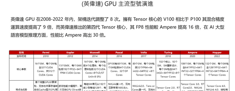 Invincible GPU has undergone eight iterations of architecture adjustments from 2008 to 2022. The V100 with Tensor core has a mixed-precision computing speed that is 9 times faster than the P100, and the fourth-generation Tensor core launched by Invincible has a FP8 performance that is 16 times higher than Ampere, and in terms of AI large language model reasoning, the performance is 30 times higher than Ampere.